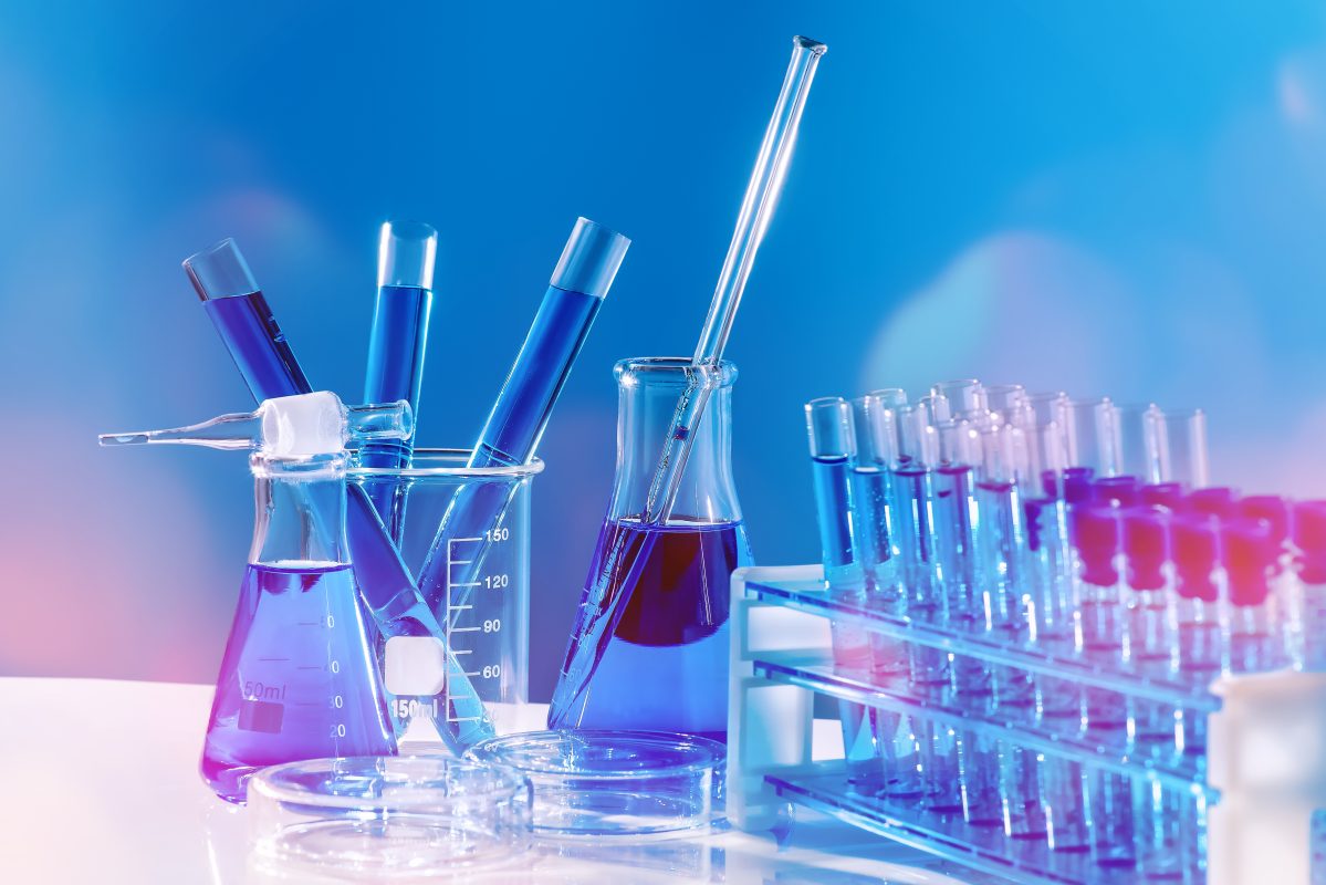 Collection of medical flasks on a blue background.Science glass flask blue chemistry laboratory banner background. Concept of medicine