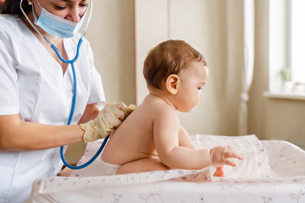 Young female pediatrician vaccinates a little baby boy Immunization for children concept. Happy little cute boy getting a flu shot not afraid of the syringe needle. Doctor injecting brave child with Covid-19 vaccine. High quality photo